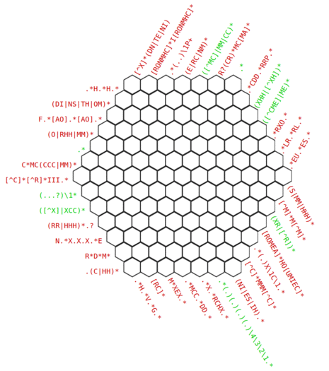 The hexagonal layout allows three regex constraints to be imposed on each cell rather than two for a rectangular layout, providing additional challenge.